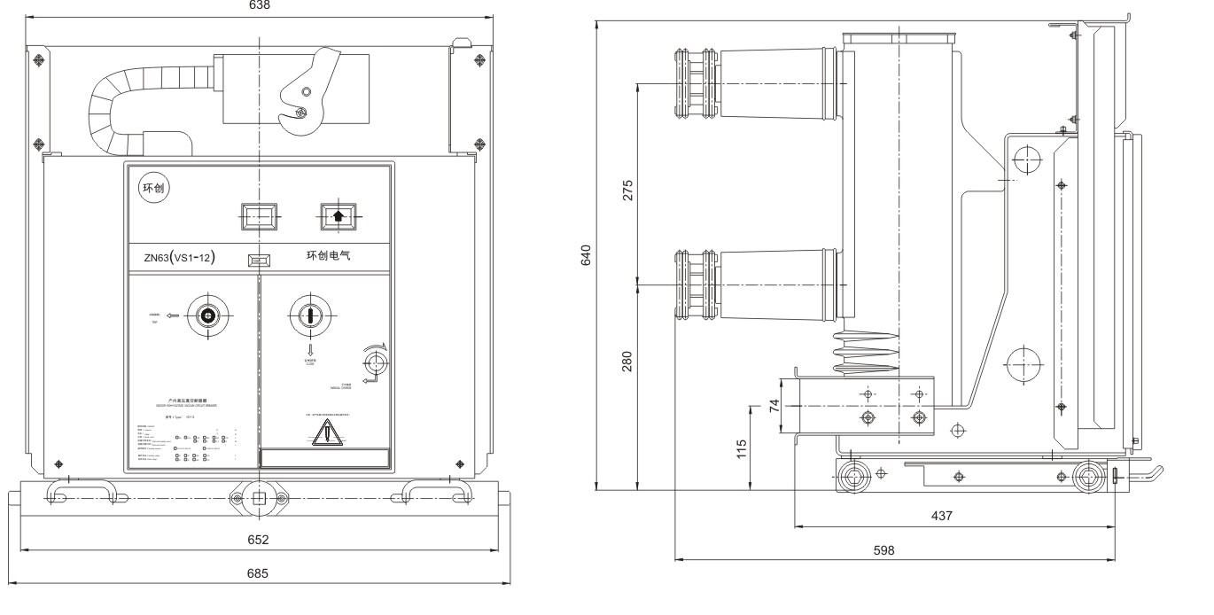 該斷路器采用操動(dòng)機(jī)構(gòu)與斷路器本體一體式設(shè)計(jì),即可做為固定安裝單元,也可配有專用推進(jìn)機(jī)構(gòu),組成手車單元作用。