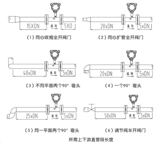渦輪流量計(jì)對(duì)管道內(nèi)流速分布畸變及旋轉(zhuǎn)流是敏感的,進(jìn)入傳感器應(yīng)為充分發(fā)展湍流,因此要根據(jù)傳感器上游側(cè)阻流件類型配備必要的直管段或整流器,要求入口段和出口段直管段長(zhǎng)度。