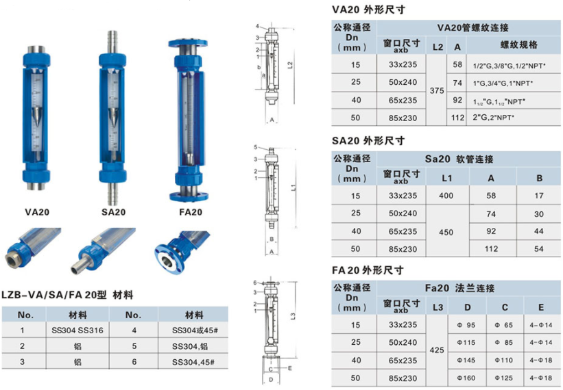 LZB-VA/SA/FA20玻璃轉(zhuǎn)子流量計(jì)與同類產(chǎn)品比較具有測(cè)量精度高,互換性好,連接方式多等優(yōu)點(diǎn)?商峁┖撩讟(biāo)尺;百分標(biāo)尺;流量標(biāo)尺和可拆卸的外標(biāo)度尺,方便不同用戶使用,連接方式有LZB-VA2O管螺紋連接,LZB-SA20軟管連接,LZB-FA20法蘭連接(活套法蘭結(jié)構(gòu))。