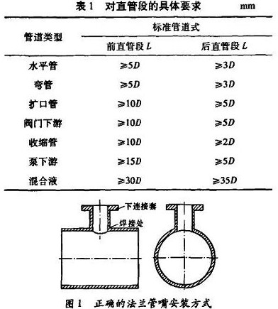 流體在方向、管徑以及閥門開度變化時(shí),會(huì)產(chǎn)生渦流和流場畸變,這樣會(huì)對傳感器電極的測量產(chǎn)生影響,從而影響儀表的精度。所以要盡可能地離開彎管、手閥、調(diào)節(jié)閥等部件一定距離,直管段的具體要求見表l。表中,D表示管道通徑,L表示傳感器到閥門或彎頭等部件的距離。