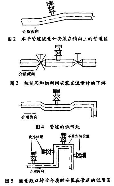 為了保障測量精度,傳感器應(yīng)避免在容易產(chǎn)生真空、氣體、渦流等地方安裝。傳感器與智能變送器之間的通訊電纜要避開電動(dòng)機(jī)等強(qiáng)電設(shè)備。建議安裝在圖2一圖5所示位置。
