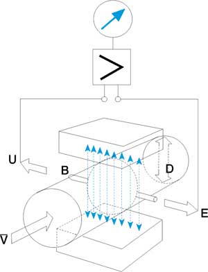 B-磁通密度;D-測(cè)量管內(nèi)徑;V-流量信號(hào)(電動(dòng)勢(shì));U-液體平均軸向流速