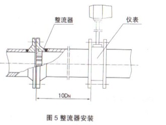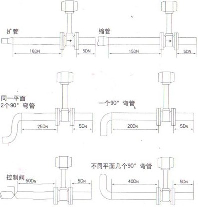 渦街流量計(jì)傳感器前后應(yīng)有足夠長(zhǎng)的圓形直管段,其內(nèi)徑光滑并與通徑DN一致。前后直管段視前面狀態(tài)而變,確保流體為充分發(fā)展的流態(tài)。詳見(jiàn)圖3