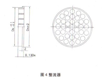 整流器的安裝:場(chǎng)地限制,直管段無(wú)法滿(mǎn)足,應(yīng)安裝整流器,見(jiàn)圖4,是一種非均勻分布多孔整流器,結(jié)構(gòu)簡(jiǎn)單,成本低,安裝方便,阻力損失小,安裝見(jiàn)圖5。