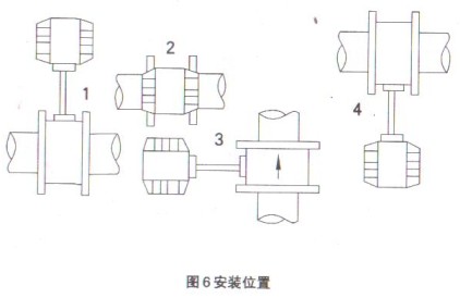 安裝條件:渦街流量計(jì)應(yīng)遠(yuǎn)離振動(dòng)源,有振動(dòng)時(shí)在前后直管段2DN處加支架用橡皮減振。傳感器通徑圓應(yīng)與直管段內(nèi)徑圓保持同心。法蘭焊接時(shí),密封夾緊時(shí),管內(nèi)不得有突出部分。流向應(yīng)與箭頭方向一致。(高溫時(shí)推薦2、3、4位置,常溫和低溫時(shí)推薦1位置,垂直管道時(shí)選3位置)見(jiàn)圖6