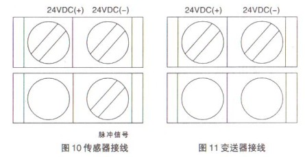 變送器為兩線(xiàn)制:采用二芯電纜,渦街“+”、“-”端子分別接+24V及測(cè)試儀表信號(hào)輸入“+”端,信號(hào)“-”端與24VDC“-”端鏈接,該回路輸出4~20mA。見(jiàn)圖11