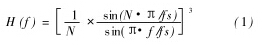 當(dāng)流體流速較小時(shí), 工頻干擾信號(hào)與有效流量信號(hào)在同一數(shù)量級(jí), 嚴(yán)重影響測(cè)量結(jié)果。已知工頻耦合噪聲基波頻率為 50 Hz , 因此可以采用模擬或數(shù)字濾波器使濾波器帶寬限制在 50 Hz以內(nèi)以抑制噪聲。在實(shí)際應(yīng)用中使用 Sigma Delta模數(shù)轉(zhuǎn)換器 AD7714內(nèi)部包含的數(shù)字濾波模塊, 數(shù)字濾波器相對(duì)模擬濾波器除具有靈活性高、參數(shù)設(shè)置方便等特點(diǎn)之外,還可以降低 A /D 轉(zhuǎn)換期間引入的噪聲。AD7714數(shù)字濾波器為 ( sinx /x )3低通濾波器, 其在頻域的傳遞函數(shù)為: