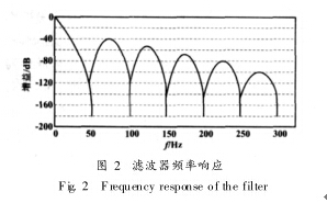 式中: fs為采樣頻率; AD7714采樣頻率為 1912 kHz ; N為濾波采樣個(gè)數(shù); f 為數(shù)字濾波器響應(yīng)頻率。通過設(shè)定濾波采樣個(gè)數(shù)可以改變數(shù)字濾波器的截止頻率和一次陷波頻率。在本設(shè)計(jì)中綜合考慮模數(shù)轉(zhuǎn)換速度和去除噪聲性能, 設(shè)置 N 值使濾波器截止頻率為 50 Hz, 濾波器頻域響應(yīng)如圖 2所示, 濾波器對(duì)工頻 50 Hz及其偶次諧波有很好的抑制作用。