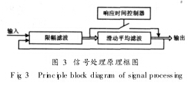 泥漿干擾是在測(cè)量泥漿、纖維漿等固液兩相特性液體時(shí), 固體顆;蛘邭馀菖c電極發(fā)生摩擦, 在電極表面的電化學(xué)電動(dòng)勢(shì)突然變化, 電磁流量計(jì)傳感器輸出信號(hào)輸出尖峰脈沖狀干擾。在低頻勵(lì)磁情況下, 泥漿干擾產(chǎn)生的尖脈沖數(shù)量級(jí)大, 極大地影響流量的準(zhǔn)確測(cè)量,在實(shí)際設(shè)計(jì)中,采用多種信號(hào)處理混合方式抑制噪聲,信號(hào)處理原理如圖 3所示。