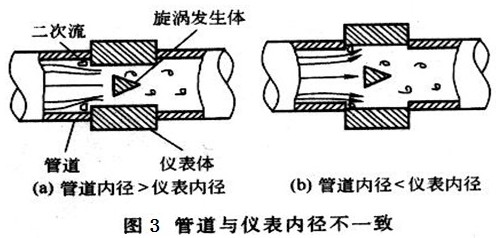 而渦街流量計(jì)與安裝管道內(nèi)徑也會(huì)存在誤差,或大或小,如圖3所示,當(dāng)被測介質(zhì)經(jīng)過時(shí),也會(huì)發(fā)生二次流動(dòng),對測量結(jié)果產(chǎn)生波動(dòng)影響。