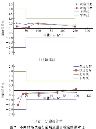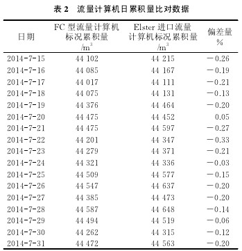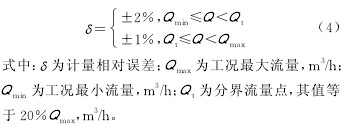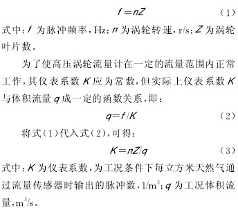 天然氣作為一種高效清潔能源,其需求量隨著全球低碳經(jīng)濟(jì)的發(fā)展呈現(xiàn)快速增長(zhǎng)趨勢(shì),預(yù)計(jì)2020 年國(guó)內(nèi)天然氣需求量將達(dá) 3 000×108m3[1-4]。進(jìn)口渦輪流量計(jì)一直占據(jù)著高壓管道貿(mào)易計(jì)量市場(chǎng),而國(guó)產(chǎn)渦輪流量計(jì)通常應(yīng)用于低壓管道,用戶主要為城市燃?xì)獾墓I(yè)用戶。 隨著工業(yè)過(guò)程控制自動(dòng)化的實(shí)施及輸氣管道的大量建設(shè),對(duì)貿(mào)易計(jì)量所需的渦輪流量計(jì)和具有強(qiáng)大功能的流量計(jì)算機(jī)的需求量也不斷增大,因此,擁有自主知識(shí)產(chǎn)權(quán)且滿足工業(yè)性應(yīng)用要求的精度好的高壓渦輪流量計(jì)與流量計(jì)算機(jī),對(duì)實(shí)現(xiàn)管道設(shè)備的國(guó)產(chǎn)化,打破國(guó)外技術(shù)壟斷,保障管道安全、經(jīng)濟(jì)、高效運(yùn)行,具有十分重要的意義。為了評(píng)價(jià)國(guó)產(chǎn)化流量計(jì)在實(shí)際運(yùn)行過(guò)程中的準(zhǔn)確度、可重復(fù)性、穩(wěn)定性及安全性等指標(biāo),為后續(xù)新建管道的推廣應(yīng)用及流量計(jì)的制造、改進(jìn)提供依據(jù),對(duì) 4 臺(tái)國(guó)產(chǎn) 氣體高壓渦輪流量計(jì)和FC 型流量計(jì)算機(jī)進(jìn)行了現(xiàn)場(chǎng)工業(yè)性試驗(yàn)。 1 高壓氣體渦輪流量計(jì) 1.1 工作原理 高壓氣體渦輪流量計(jì)是一種帶機(jī)械計(jì)數(shù)器并用于準(zhǔn)確測(cè)量氣體流量的流量計(jì),其工作原理:當(dāng)高壓氣流進(jìn)入流量計(jì)時(shí),首先經(jīng)過(guò)整流器整流并加速,在流體的作用下,渦輪克服阻力矩開(kāi)始轉(zhuǎn)動(dòng);當(dāng)力矩達(dá)到平衡時(shí),渦輪轉(zhuǎn)速穩(wěn)定,此時(shí)其轉(zhuǎn)速與氣體工況流量成正比,并通過(guò)齒輪減速傳動(dòng);磁耦合聯(lián)接驅(qū)動(dòng)字輪計(jì)數(shù)器轉(zhuǎn)動(dòng),直接累積氣體的工況體積總量。 因?yàn)橥ㄟ^(guò)渦輪的流量與渦輪轉(zhuǎn)速成正比,所以高頻信號(hào)脈沖輸出頻率與渦輪轉(zhuǎn)速存在以下關(guān)系[7]: 綜上所述,儀表系數(shù)K 除與渦輪導(dǎo)程、葉片數(shù)、葉片寬度、螺旋升角、流量計(jì)流體通道等結(jié)構(gòu)因素有關(guān)外,還與介質(zhì)流體黏性、軸承本身阻尼、軸承潤(rùn)滑油黏度等有關(guān),若以上其中一種或幾種相關(guān)因素發(fā)生改變,則儀表系數(shù)K 也會(huì)相應(yīng)改變,因此流量計(jì)應(yīng)通過(guò)線性檢定等試驗(yàn)方式進(jìn)行最終設(shè)計(jì)確認(rèn)。 1.2 性能測(cè)試 以 EN 12261-2002《Gas meters - Turbine gasmeters》[8]和 OIML R137-1-2006《氣體流量計(jì)》作為流量計(jì)產(chǎn)品的研制依據(jù),并嚴(yán)格按照標(biāo)準(zhǔn)進(jìn)行性能測(cè)試,主要包括:耐久性試驗(yàn)、彎矩與扭矩試驗(yàn)、短時(shí)過(guò)載試驗(yàn)、擾動(dòng)試驗(yàn)以及高低溫性能測(cè)試等。 1.2.1 耐久性測(cè)試 渦輪流量計(jì)進(jìn)行耐久性測(cè)試的目的在于確認(rèn)流量計(jì)在指定條件下的計(jì)量性能是否符合分段要求[9],即: 確認(rèn)各種安裝位置是否影響測(cè)試樣機(jī)的計(jì)量性能,安裝位置可分為水平方向、垂直向上與垂直向下。在不同安裝位置情況下,樣機(jī)在耐久性測(cè)試前后指示誤差的變化量不得超過(guò)式(4)要求值的 1/3。 以 DN80-G100 樣機(jī)為例,進(jìn)行耐久性測(cè)試說(shuō)明。首先將 3 臺(tái)樣機(jī)分別安裝在同一管道的不同位置,管道內(nèi) 0.8 MPa 壓縮氣體以樣機(jī)最大流量進(jìn)行循環(huán)運(yùn)行,以每 1 000 h 為運(yùn)行單位,將樣機(jī)拆卸并在標(biāo)準(zhǔn)氣體流量裝置上進(jìn)行相應(yīng)性能測(cè)試,得到 7 000 h 運(yùn)行測(cè)試數(shù)據(jù)(圖 1)。 結(jié)果表明:該測(cè)試樣機(jī)滿足耐久性測(cè)試要求,指示誤差的變化量未超過(guò)最大允許誤差的 1/3;軸承經(jīng)過(guò)長(zhǎng)時(shí)間運(yùn)行磨合更趨于穩(wěn)定,長(zhǎng)期運(yùn)行后非線性段更趨于理想特性曲線。 1.2.2 彎扭矩測(cè)試 對(duì)于高壓渦輪流量計(jì),應(yīng)該詳細(xì)說(shuō)明流量計(jì)所需的彎曲與扭力力矩的保護(hù)水平[2]。該數(shù)據(jù)可以通過(guò)試驗(yàn)直接獲得(圖 2,其中直管段 1 連接氣體流量標(biāo)準(zhǔn)裝置,圖 2a 中在直管段 2 預(yù)先確定的力臂L 位置附加垂直方向的力F 而形成彎矩M;圖 2b 中在直管段 2 側(cè)面預(yù)先確定的力臂L 位置附加垂直方向的力F 而形成扭矩T,而彎矩與扭矩均是作用于流量計(jì)入口與出口法蘭處)。由于該項(xiàng)測(cè)試主要是針對(duì)流量計(jì)強(qiáng)度的校核,為了使測(cè)試結(jié)果更具說(shuō)服力,并且提高其可靠性,將鋁合金殼體的中低壓渦輪流量計(jì) DN80-G100 用于此次測(cè)試。測(cè)試過(guò)程中按照 EN 12261-2002 表 10中要求施加 1 倍、2 倍直至 4 倍(即力矩為 3 040 N·m)的砝碼F,未發(fā)現(xiàn)流量計(jì)殼體有任何異常變化。施加砝碼F 時(shí)及卸下砝碼之后得到的指示誤差與施加砝碼F 之前的指示誤差無(wú)明顯變化,實(shí)際變化量均在最大允許誤差的 1/3 以內(nèi)。 1.2.3 常壓與高壓試驗(yàn)對(duì)比 為了確認(rèn)高壓渦輪流量計(jì)在高壓氣體介質(zhì)中計(jì)量性能是否滿足