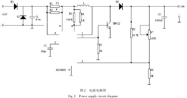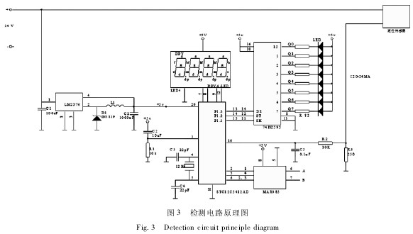 0引言 液位包括液位信號(hào)器和連續(xù)液位測(cè)量?jī)煞N。液位信號(hào)器是對(duì)幾個(gè)固定位置的液位進(jìn)行測(cè)量,用于液位的上、下限報(bào)警等;連續(xù)液位測(cè)量是對(duì)液位連續(xù)地進(jìn)行測(cè)量,廣泛應(yīng)用于農(nóng)田灌溉、定量施量、高爐沖渣水位測(cè)量、環(huán)境監(jiān)測(cè)等農(nóng)業(yè)生產(chǎn)領(lǐng)域,具有非常重要的意義。目前,對(duì)液位測(cè)量的精度要求不僅愈來(lái)愈高,且需要測(cè)量?jī)x能夠適應(yīng)一些特殊環(huán)境,如高溫、高壓、強(qiáng)放射性及強(qiáng)腐蝕性等條件。液態(tài)肥因其生產(chǎn)費(fèi)用低、肥效高、易吸收、節(jié)支增產(chǎn)效果顯著及施用過(guò)程中可以根據(jù)需要加入土壤所缺少的植物營(yíng)養(yǎng)元素等優(yōu)勢(shì)迅速得到了廣泛應(yīng)用。而變量施肥作為農(nóng)業(yè)的重要部分,其技術(shù)基礎(chǔ)就是對(duì)液肥液位的準(zhǔn)確控制。目前市場(chǎng)上,液位控制系統(tǒng)大致可分為以下兩種: 1)機(jī)械式控制系統(tǒng)。機(jī)械式控制系統(tǒng)結(jié)構(gòu)簡(jiǎn)單、成本低廉;但這種控制裝置故障多、誤動(dòng)作多,且只能單獨(dú)控制,與計(jì)算機(jī)進(jìn)行通信較難實(shí)現(xiàn)。 2)交流調(diào)壓/變頻調(diào)速控制系統(tǒng)。該系統(tǒng)是通過(guò)安裝在水泵出口管道上的壓力傳感器,把出口壓力變成標(biāo)準(zhǔn)工業(yè)電信號(hào)的模擬信號(hào),經(jīng)過(guò)前置放大、多路切換、A/D變換成數(shù)字信號(hào)傳送到單片機(jī),經(jīng)單片機(jī)運(yùn)算與給定量的比較,進(jìn)行PID運(yùn)算,得出調(diào)節(jié)參量;經(jīng)由D/A變換給調(diào)壓/變頻調(diào)速裝置輸入給定端,控制其輸出電壓變化,來(lái)調(diào)節(jié)電機(jī)的轉(zhuǎn)速,以達(dá)到控制水位的目的。 本文以液態(tài)施肥機(jī)為依托,針對(duì)一定體積的液肥進(jìn)行液位試驗(yàn),通過(guò)以單片機(jī)和投入式液位計(jì)為主要硬件資源設(shè)計(jì)硬件電路,畫(huà)出相應(yīng)的軟件流程圖進(jìn)行測(cè)試。數(shù)據(jù)分析驗(yàn)證表明:該傳感器在液肥液位測(cè)量中安裝維護(hù)方便,能適應(yīng)液肥這種特殊環(huán)境,其容量和液位高度的測(cè)量誤差也滿(mǎn)足實(shí)際要求。 1系統(tǒng)工作原理及組成 微壓式液位計(jì)采用的是壓力敏感元件實(shí)現(xiàn)力-電轉(zhuǎn)換。傳感器的液位量程是0~1.3m,且這段量程液位所對(duì)應(yīng)的深度約合壓力相比其他要小很多,因而稱(chēng)其為“微壓式”。本系統(tǒng)是所選的正是微壓式傳感器,它將液位信號(hào)轉(zhuǎn)換為4~20mA標(biāo)準(zhǔn)電信號(hào)輸出。 若設(shè)所測(cè)液體密度為ρ,液位高度為h,大氣壓為ρ0,重力加速度為g,則液體所受壓力p=ρgh+ρ0。這時(shí),為抵消大氣壓力變化所帶來(lái)的測(cè)量誤差,傳感器變送器部分采用導(dǎo)氣電纜將大氣壓力ρ0引入敏感元件的負(fù)壓腔,進(jìn)而使p=ρgh。顯然,若已知液體密度,通過(guò)測(cè)取壓力p就可換算出相應(yīng)的液位高度。 1.1單片機(jī)選型 該系統(tǒng)結(jié)構(gòu)相對(duì)簡(jiǎn)單、運(yùn)行速度快,考慮到功能和成本兼顧,采用以擴(kuò)展性51系列單片機(jī)STC12C5412AD為核心控制元件。該芯片具有12kB用戶(hù)可自行安排的FLASH及FEPROM空間比例;在同樣的工作頻率下,平均指令運(yùn)算速度是普通8051的8~12倍[4],滿(mǎn)足系統(tǒng)對(duì)數(shù)據(jù)處理的要求,且掉電模式可由外部中斷喚醒,適用車(chē)載信息系統(tǒng)。系統(tǒng)設(shè)計(jì)方案圖如圖1所 1.2投入式液位計(jì)選型 其基于所測(cè)液體靜壓與該液體的高度成比例的原理,再將靜壓轉(zhuǎn)換為電信號(hào),實(shí)現(xiàn)非電量到電量的變換,利用這一特性來(lái)完成對(duì)液位的測(cè)量。主要技術(shù)參數(shù)如下:量程1.3m,精度0.5%Fs,電壓18~36VDC,輸出4~20mA。 其優(yōu)點(diǎn)包括:①能實(shí)時(shí)測(cè)量罐內(nèi)各點(diǎn)液位;②直流4~20mA標(biāo)準(zhǔn)電流信號(hào)輸出;③密封性好,測(cè)量元件不與液肥直接接觸,避免了液肥對(duì)元件的腐蝕。 2硬件電路設(shè)計(jì) 2.1電源電路設(shè)計(jì) 電源電路圖如圖2所示。圖2中,為了保證液位傳感器能獲得24V的直流供電,選用具有DC-DC單片控制電路功能的MC34063芯片,片內(nèi)包含有溫度補(bǔ)償帶隙基準(zhǔn)源,能輸出1.5A的開(kāi)關(guān)電源,且是使用最少的外接元件構(gòu)成的升壓變換器、降壓變換器和電源反向器[5]。 本系統(tǒng)電源電路采用具有升壓轉(zhuǎn)換作用的MC34063芯片,與電感L、二極管D3、三極管TIP122一起構(gòu)成電源電路。若TIP122導(dǎo)通時(shí),+12V的輸入電壓經(jīng)采樣限流電阻R1、R2,流經(jīng)電感L,隨著電感L電流增加,其兩端進(jìn)行儲(chǔ)存能量。此時(shí),二極管D3是防止電容C3對(duì)地放電,并由電容C3向負(fù)載供電;若TIP122斷開(kāi)時(shí),電感L及12V的輸入電壓對(duì)電容C3充電的同時(shí)電容C3對(duì)負(fù)載供電,負(fù)載電壓穩(wěn)定在+24V,穩(wěn)壓的負(fù)反饋信號(hào)是電阻R7、R8的分壓輸入到MC36063的5腳。 2.2檢測(cè)電路設(shè)計(jì) 硬件部分的核心為STC12C5412AD,工作電壓由LM2576從24V轉(zhuǎn)變?yōu)?V來(lái)提供。同時(shí),用MCU