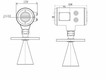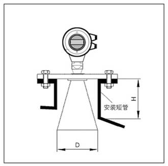 - 如果喇叭直徑大于安裝短管的直徑,包括延伸管在內的天線需要從容器里面安裝,并將儀表抬高。選擇延伸管使儀表至少抬高100mm。