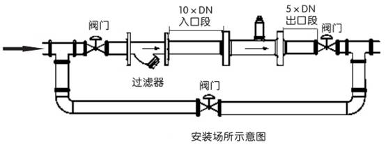●水平安裝傳感器要求管道不應(yīng)有目測可察覺的傾斜(一般在5°以內(nèi)),垂直安裝傳感器管道垂直度偏差亦應(yīng)小于5°。在不能停流的場所,應(yīng)裝旁通管和可靠的截止閥(見圖4-7),測量時要確保旁通管無泄漏。
