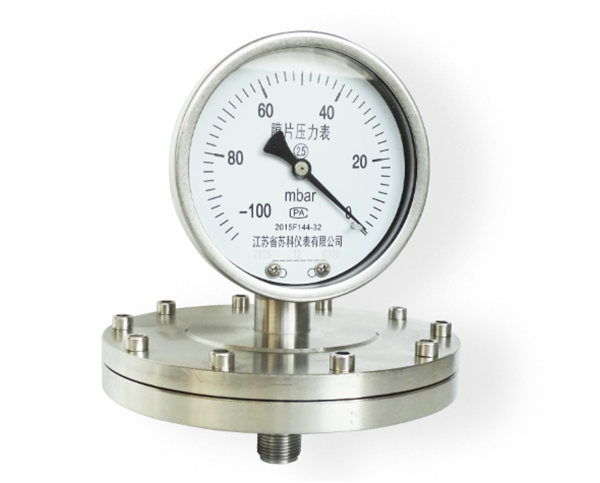 膜片壓力表由測(cè)量系統(tǒng)(包括法蘭接頭、波紋膜片)、傳動(dòng)指示機(jī)構(gòu)(包括連桿、齒輪傳動(dòng)機(jī)構(gòu)、指針和度盤(pán))和外殼(包括表殼和罩圈)等組成。膜片壓力表外殼為防濺結(jié)構(gòu),具有較好的密性,故能保護(hù)其內(nèi)部機(jī)構(gòu)免受污穢浸入。