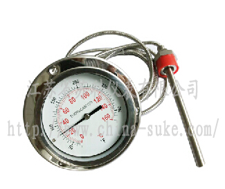 利用感溫包中液體受熱膨脹而使彈性元件產(chǎn)生偏轉(zhuǎn)來(lái)帶動(dòng)度盤(pán)轉(zhuǎn)動(dòng)指示出被測(cè)介質(zhì)的溫度。
